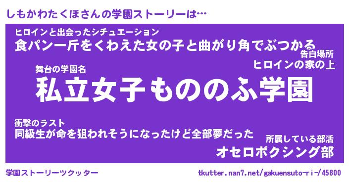 | 女子向けラノベタイトル風あだ名 | 『誰かこのしもかわたくほを説明してください! ~契約から始まるウェディング~』 |