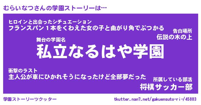 | 男性向けラノベタイトル風あだ名 | 『むらいなつの憂鬱』 |