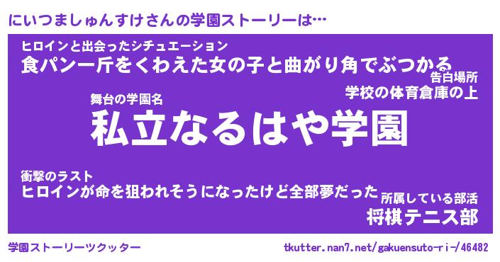 | 女子向けラノベタイトル風あだ名 | 『(仮)にいつましゅんすけのやんごとなき事情』 |