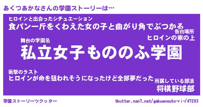 | 女子向けラノベタイトル風あだ名 | 『あくつあかな姫と円卓の騎士』 |