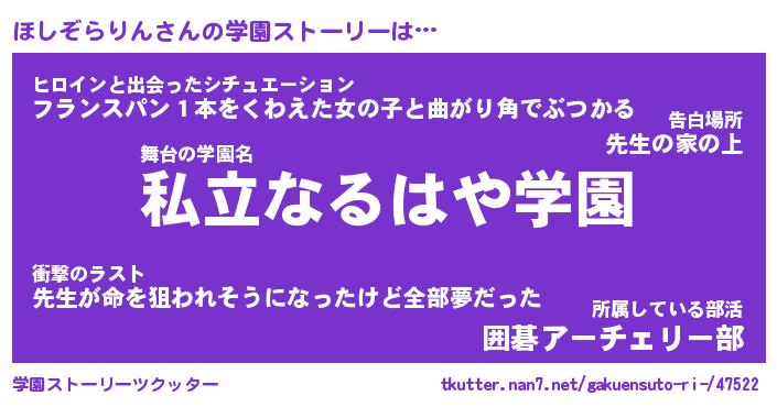 | ヒーロー風カッコイイあだ名 | 『スーパーホシゾラリン』『暗黒騎士ホシ』 |