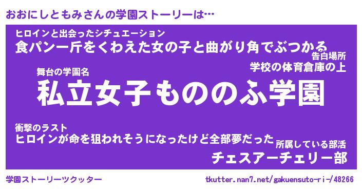| 女子向けラノベタイトル風あだ名 | 『おおにしともみ姫と円卓の騎士』 |