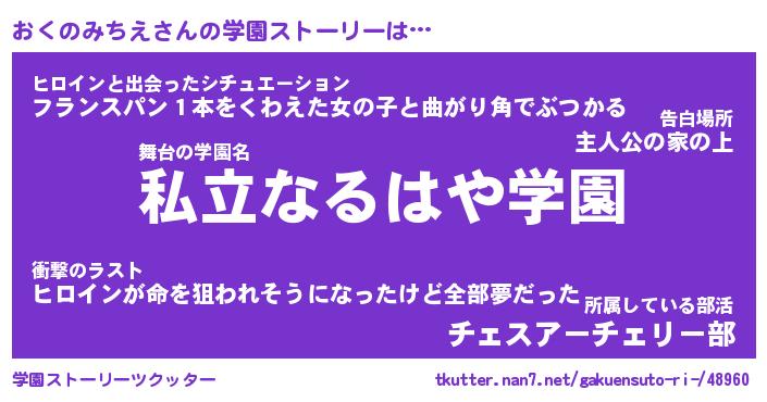 | 女子向けラノベタイトル風あだ名 | 『(仮)おくのみちえのやんごとなき事情』 |