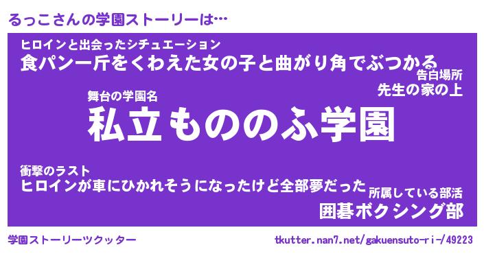 | 男性向けラノベタイトル風あだ名 | 『るっこの憂鬱』 |