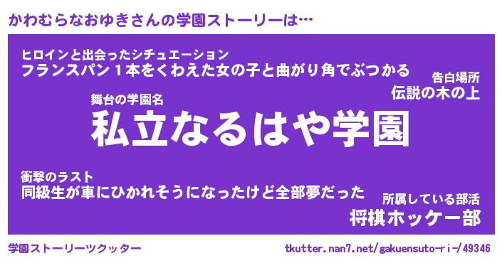 | 男性向けラノベタイトル風あだ名 | 『かわむらなおゆきの憂鬱』 |