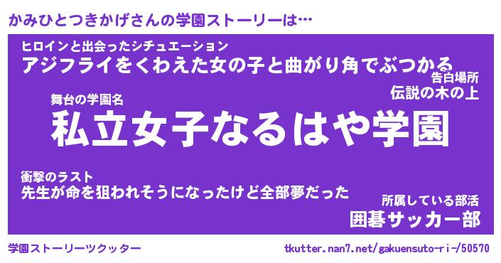 | 伝説のあだ名 | 『封印されしスナイパーかみひとつきかげ』 |