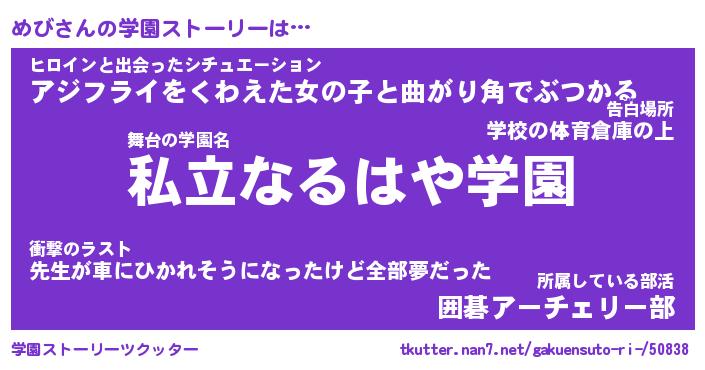 | 伝説のあだ名 | 『伝説のスナイパーめび』 |
