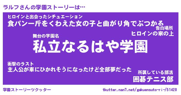 | 女子向けラノベタイトル風あだ名 | 『(仮)ラルフのやんごとなき事情』 |