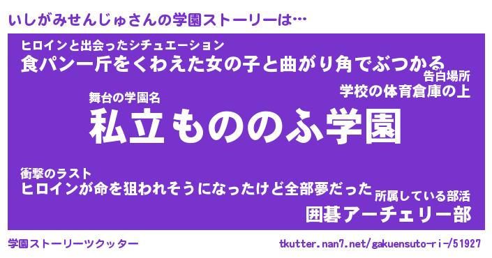 | 男性向けラノベタイトル風あだ名 | 『いしがみせんじゅの憂鬱』 |