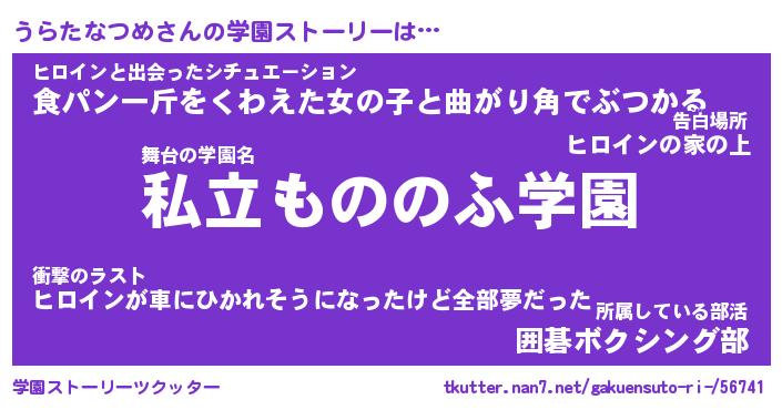| 男性向けラノベタイトル風あだ名 | 『うらたなつめの憂鬱』 |