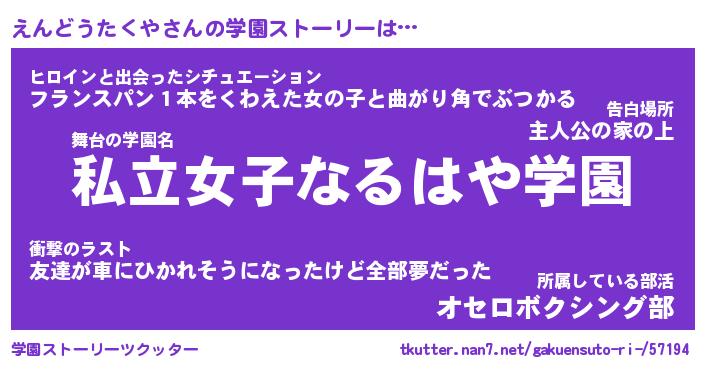 | 男性向けラノベタイトル風あだ名 | 『エンドウタクヤアートオンライン』 |