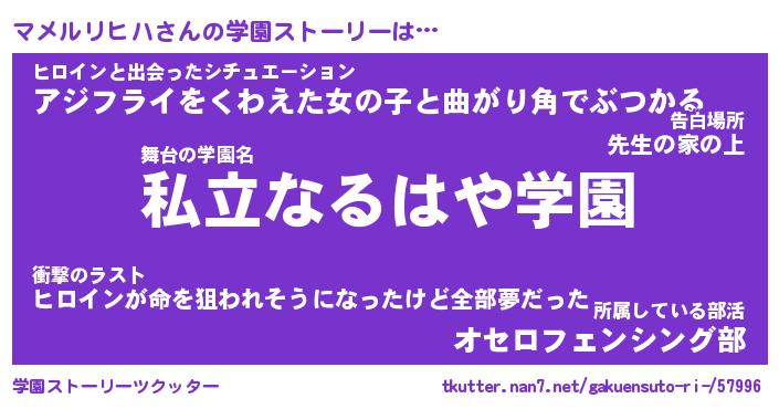 | 伝説のあだ名 | 『伝説のスナイパーマメルリヒハ』 |