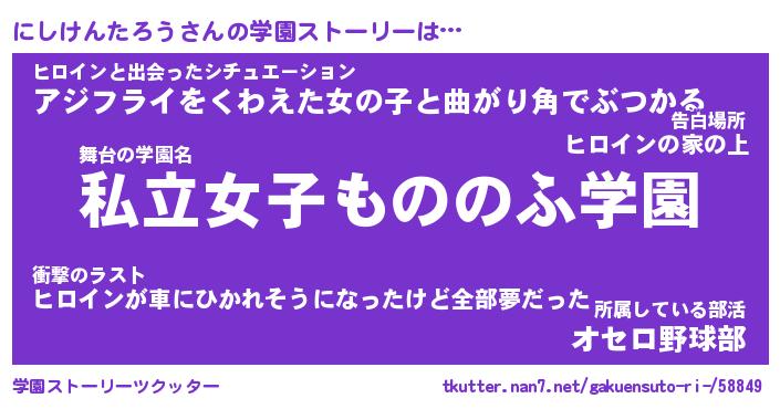 | 女子向けラノベタイトル風あだ名 | 『誰かこのにしけんたろうを説明してください! ~契約から始まるウェディング~』 |