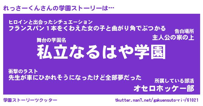 | 男性向けラノベタイトル風あだ名 | 『れっさーくんの憂鬱』 |