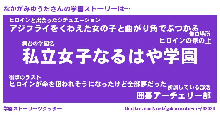 | 女子向けラノベタイトル風あだ名 | 『なかがみゆうた姫と円卓の騎士』 |
