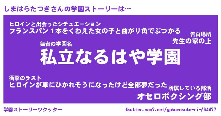 | 女子向けラノベタイトル風あだ名 | 『(仮)しまはらたつきのやんごとなき事情』 |