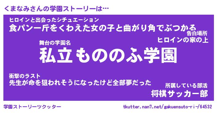 | 男性向けラノベタイトル風あだ名 | 『くまなみの憂鬱』 |