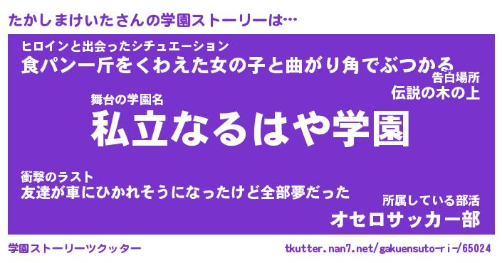 | 男性向けラノベタイトル風あだ名 | 『たかしまけいたの憂鬱』 |