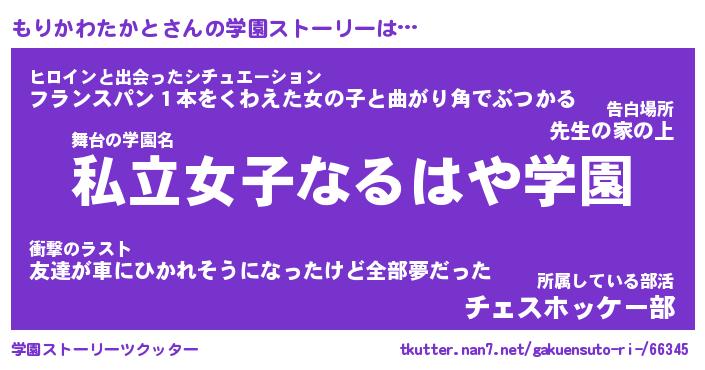 | 女子向けラノベタイトル風あだ名 | 『誰かこのもりかわたかとを説明してください! ~契約から始まるウェディング~』 |