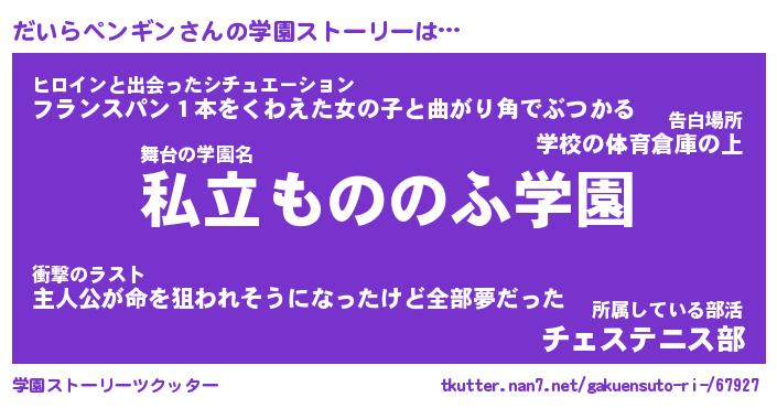 | 男性向けラノベタイトル風あだ名 | 『だいらペンギンの憂鬱』 |