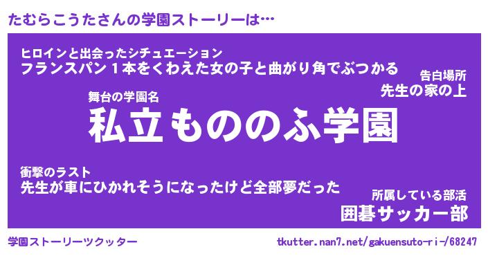 | 男性向けラノベタイトル風あだ名 | 『たむらこうたの憂鬱』 |
