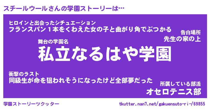 | 女子向けラノベタイトル風あだ名 | 『(仮)スチールウールのやんごとなき事情』 |