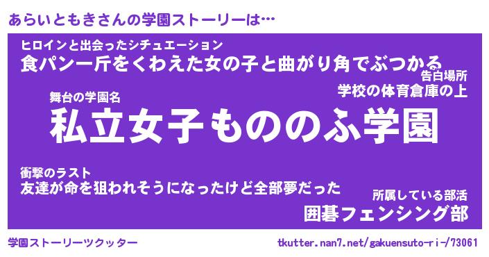 | 女子向けラノベタイトル風あだ名 | 『あらいともき姫と円卓の騎士』 |