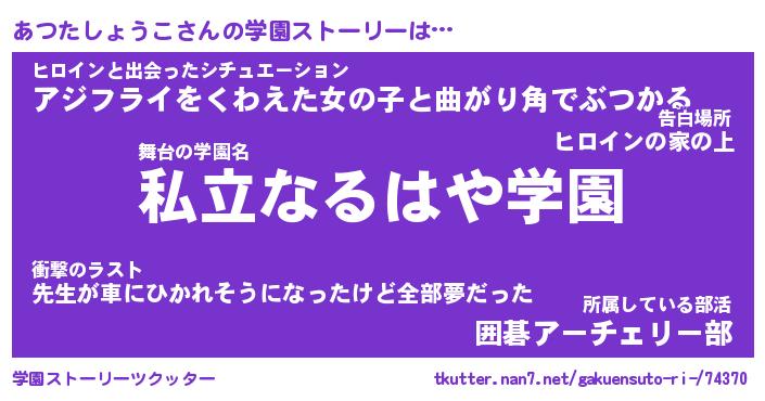 | 女子向けラノベタイトル風あだ名 | 『(仮)あつたしょうこのやんごとなき事情』 |