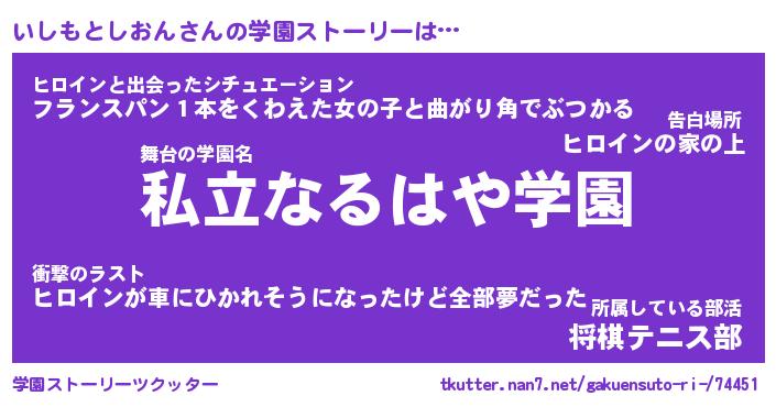 | 男性向けラノベタイトル風あだ名 | 『いしもとしおんの憂鬱』 |