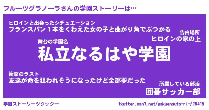 | 女子向けラノベタイトル風あだ名 | 『(仮)フルーツグラノーラのやんごとなき事情』 |