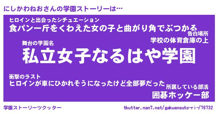 | 女子向けラノベタイトル風あだ名 | 『誰かこのにしかわねおを説明してください! ~契約から始まるウェディング~』 |