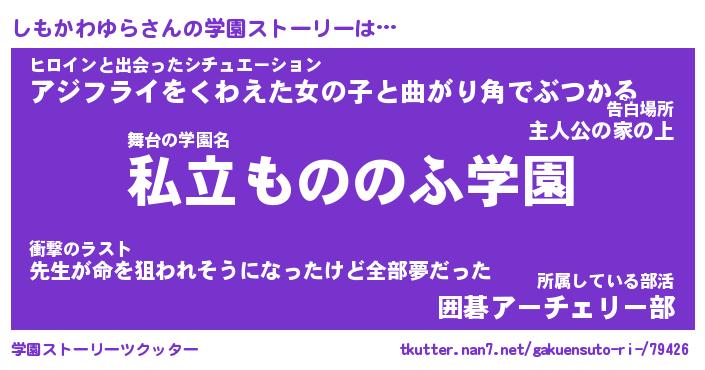 | 男性向けラノベタイトル風あだ名 | 『しもかわゆらの憂鬱』 |