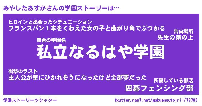 | 男性向けラノベタイトル風あだ名 | 『みやしたあすかの憂鬱』 |