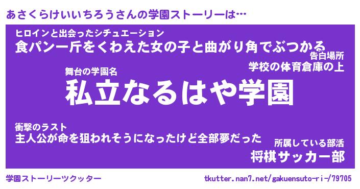 | 女子向けラノベタイトル風あだ名 | 『(仮)あさくらけいいちろうのやんごとなき事情』 |
