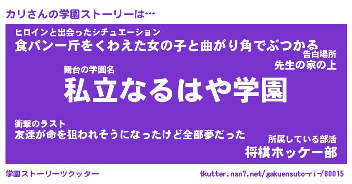 | 男性向けラノベタイトル風あだ名 | 『カリの憂鬱』『ノーゲーム・ノーカリ』 |