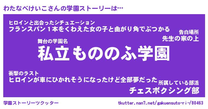 | 女子向けラノベタイトル風あだ名 | 『(仮)わたなべけいこのやんごとなき事情』 |