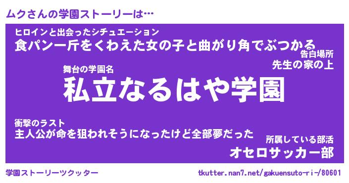 | 男性向けラノベタイトル風あだ名 | 『ムクの憂鬱』『ノーゲーム・ノームク』 |