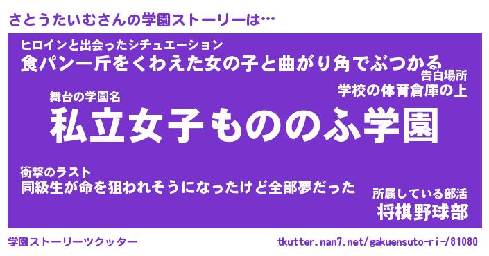 | ヒーロー風カッコイイあだ名 | 『スーパーサトウタイム』『天弓騎士サト』 |