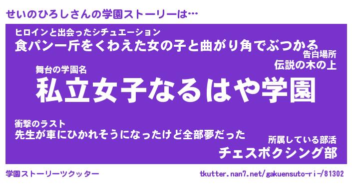 | ヒーロー風カッコイイあだ名 | 『スーパーセイノヒロシ』『天弓騎士セイ』 |