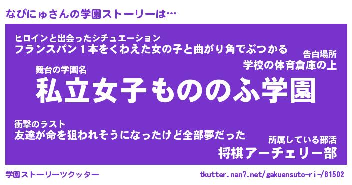 | 女子向けラノベタイトル風あだ名 | 『なびにゅ姫と円卓の騎士』 |