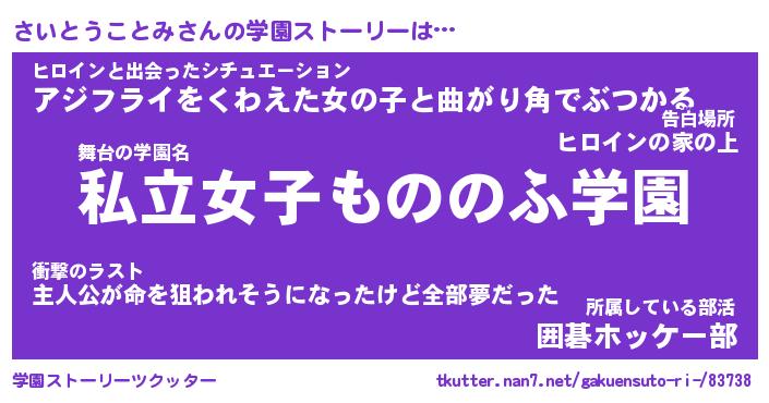 | 男性向けラノベタイトル風あだ名 | 『サイトウコトミアートオンライン』 |