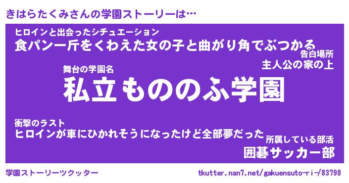 | 男性向けラノベタイトル風あだ名 | 『きはらたくみの憂鬱』 |