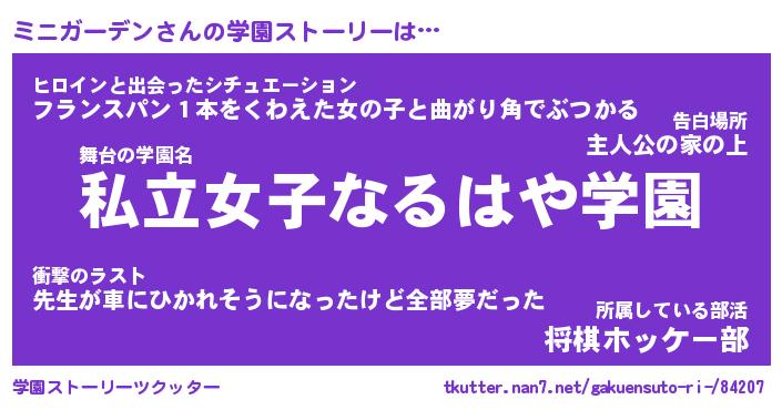 | 女子向けラノベタイトル風あだ名 | 『ミニガーデン姫と円卓の騎士』 |