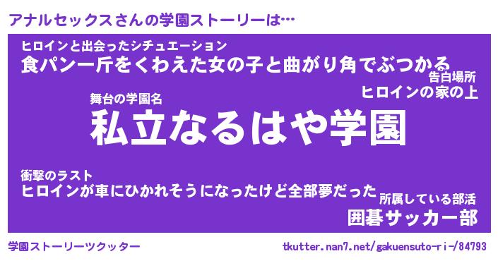 | 女子向けラノベタイトル風あだ名 | 『(仮)アナルセックスのやんごとなき事情』 |