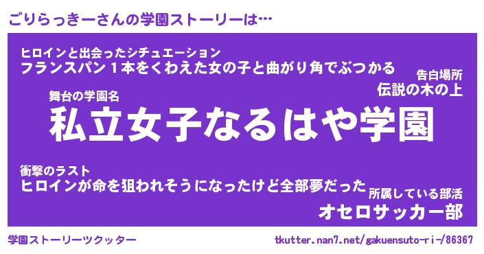 | 女子向けラノベタイトル風あだ名 | 『ごりらっきー姫と円卓の騎士』 |