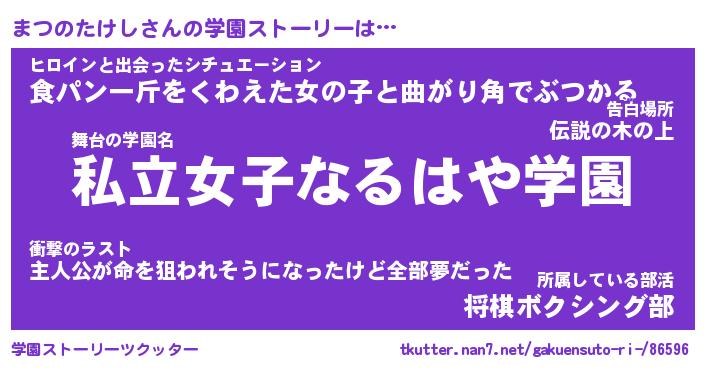 | 伝説のあだ名 | 『封印されしスナイパーまつのたけし』 |