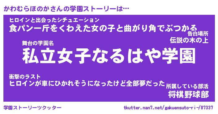 | 男性向けラノベタイトル風あだ名 | 『カワムラホノカアートオンライン』 |