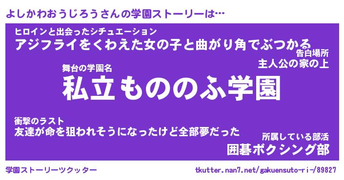 | 男性向けラノベタイトル風あだ名 | 『よしかわおうじろうの憂鬱』 |