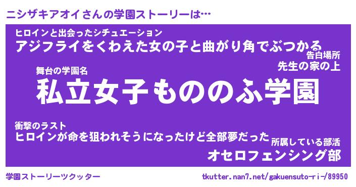 | 女子向けラノベタイトル風あだ名 | 『誰かこのニシザキアオイを説明してください! ~契約から始まるウェディング~』 |