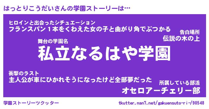 | 女子向けラノベタイトル風あだ名 | 『(仮)はっとりこうだいのやんごとなき事情』 |